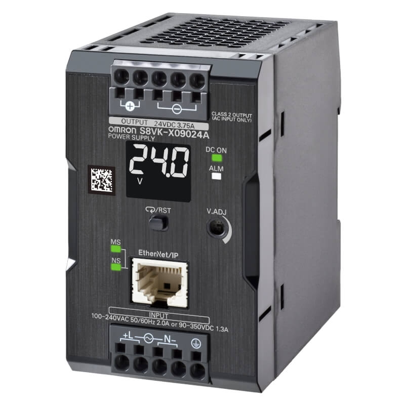 Импульсный источник питания серии S8VK с дисплеем, мощность 90 Вт, выходное напряжение 24 В, выходной ток 3,75 A, монтаж на DIN-рейку, клеммы Push-in, с покрытием, Ethernet/Modbus