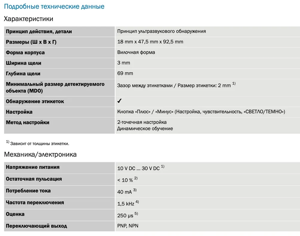 Датчик работает по принципу ультразвукового обнаружения, что обеспечивает стабильное срабатывание независимо от цвета, прозрачности или контраста материала. Минимальный размер детектируемого объекта (MDO) — от 2 мм (зазор между этикетками или размер этикетки), что делает модель оптимальной для высокоскоростных линий с малым шагом подачи.