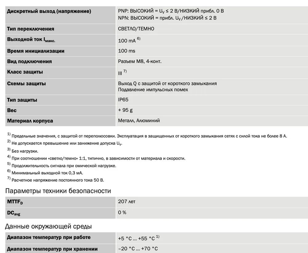 Датчик оснащён переключаемым выходом PNP/NPN и подключается через стандартный 4-контактный разъём M8. Рабочее напряжение 10–30 В DC, потребление тока — 40 мА. Металлический корпус из алюминия с защитой IP65 обеспечивает устойчивость к промышленным условиям эксплуатации при температуре от +5 до +55 °C.